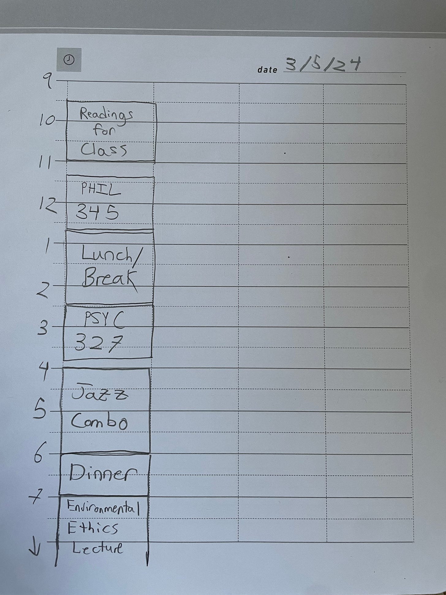 One thing I learned from time-block planning through college is that there’s actually a lot less time in the day than we tend to think. I found that in order to make meaningful progress on cognitively demanding tasks, I generally needed to block out at least an hour or two to allow ample time for my mind to settle into the kind of calm, focused state such work requires. Once I’d blocked in my scheduled commitments, I had to be very intentional about the spaces in between if I wanted to finish work at a reasonable hour.